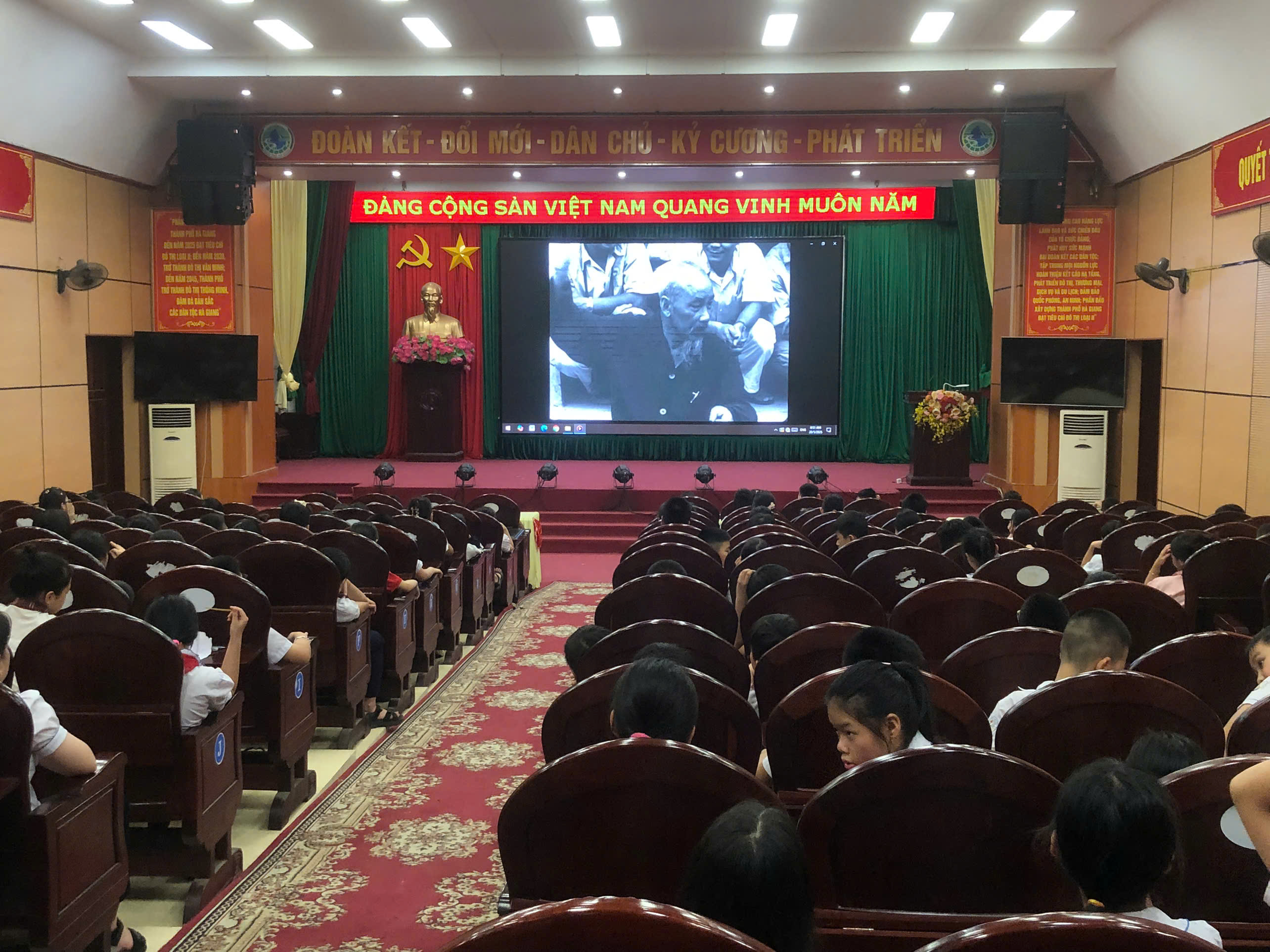Trong không khí trang nghiêm, các em học sinh đã chăm chú theo dõi những thước phim tư liệu quý như “Hồ Chí Minh hoạt động cách mạng tìm đường cứu nước, Hồ Chí Minh chân dung một con người; Bác Hồ với thiếu nhi”, “Hồ Chí Minh, hình ảnh người lãnh tụ, cha già của dân tộc”. Qua từng hình ảnh và câu chuyện xúc động, các em được tìm hiểu về tuổi thơ gian khó của Bác, hành trình bôn ba tìm đường cứu nước và đặc biệt là tình cảm sâu nặng Bác dành cho học sinh, sinh viên, với lời dạy: “Non sông Việt Nam có trở nên tươi đẹp hay không, dân tộc Việt Nam có bước tới đài vinh quang để sánh vai với các cường quốc năm châu được hay không, chính là nhờ một phần lớn ở công học tập của các em.”