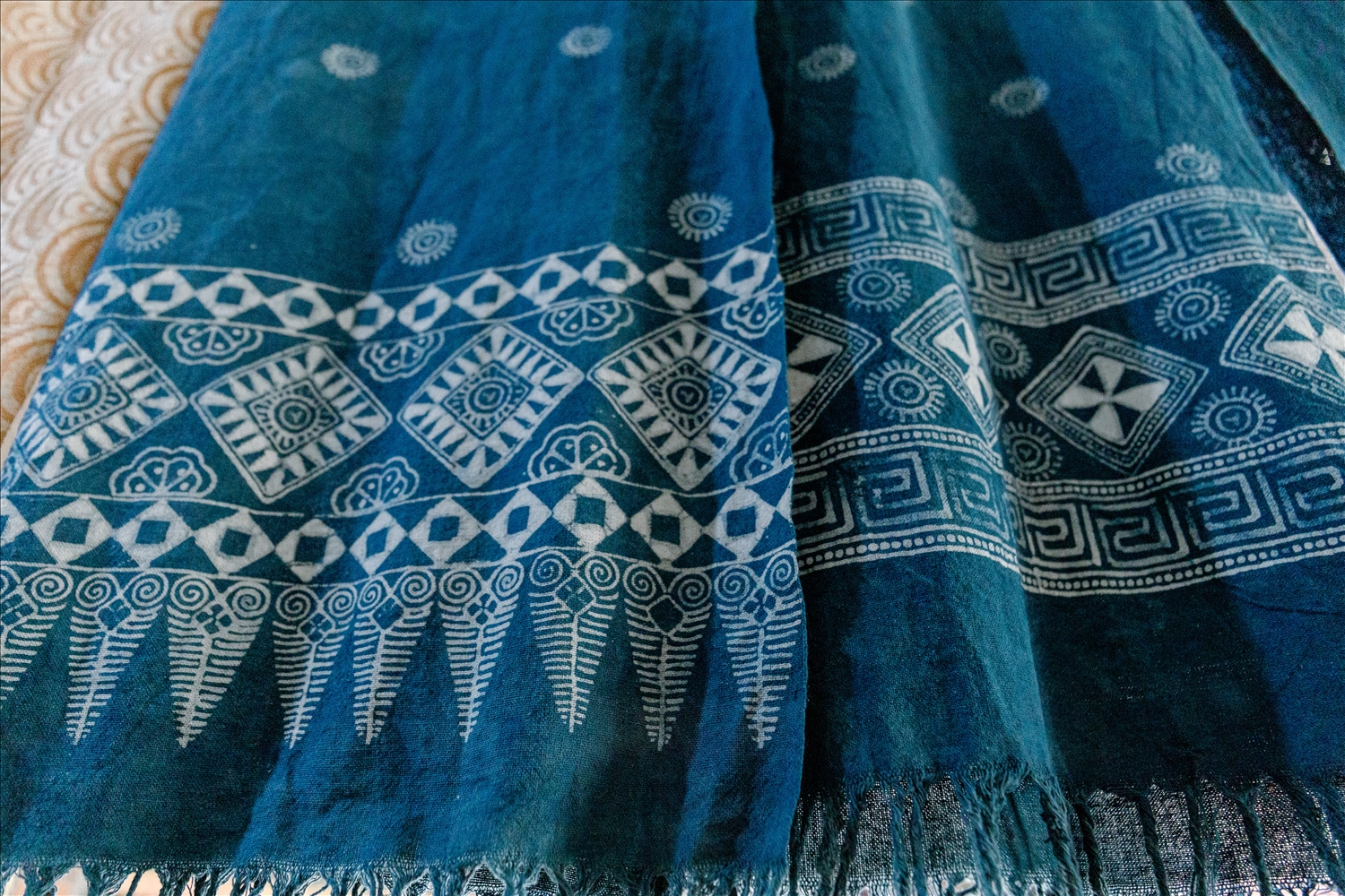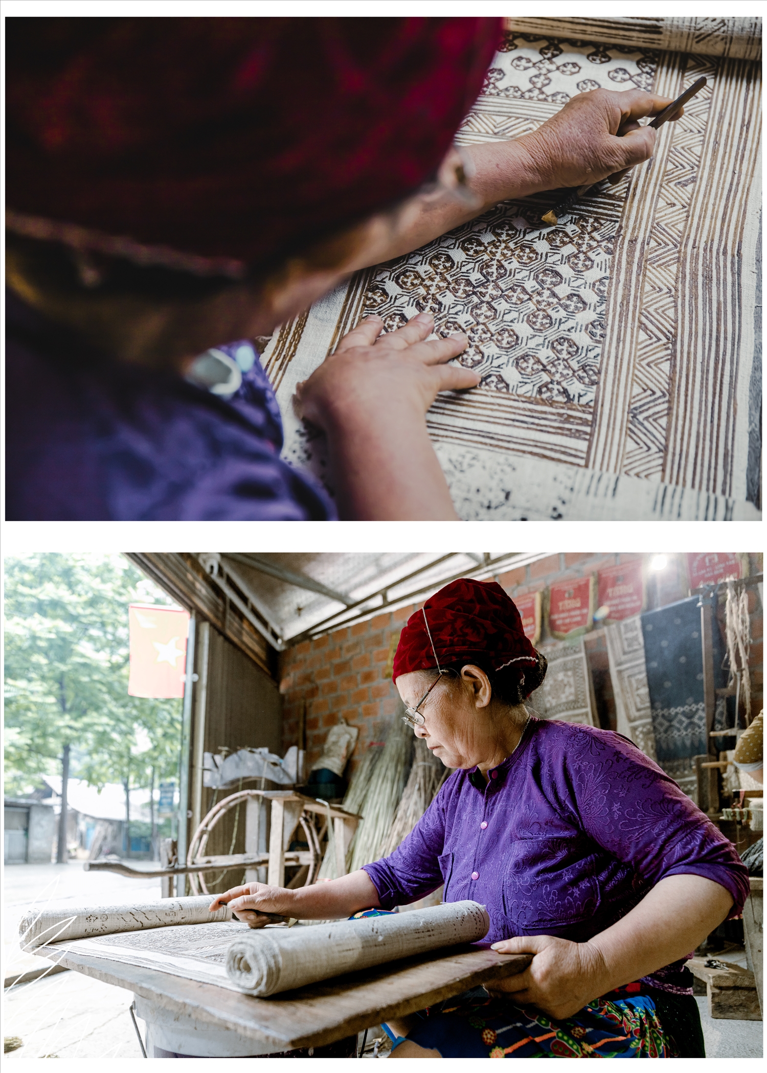 Các họa tiết, hoa văn trang trí trên các sản phẩm của HTX đều được các thành viên vẽ bằng sáp ong và thêu tay.