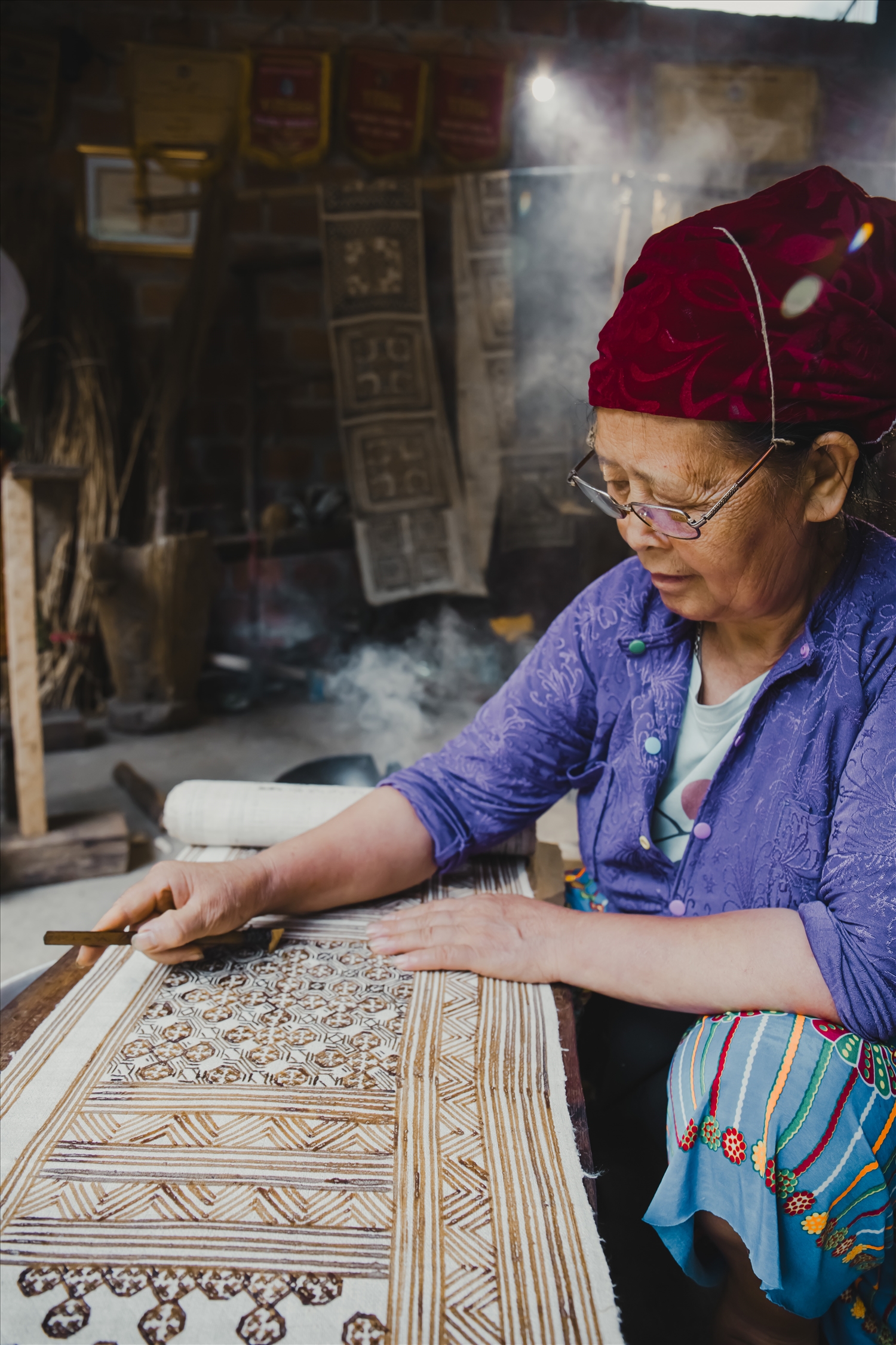 Thành viên dùng sáp ong được đun nóng để vẽ trên nền vải những họa tiết truyền thống của người Mông. Sau khi vẽ xong, vải được nhuộm màu từ cây, lá rừng, phần sáp ong không thấm màu sẽ để lại những hình hoa văn sinh động trên vải.